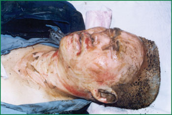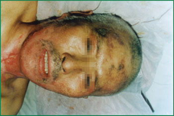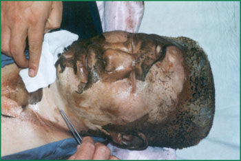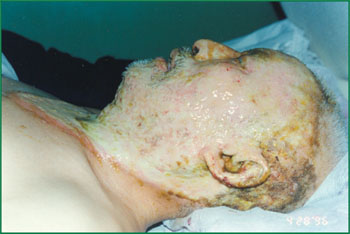 1、 面部淺Ⅲ度火焰燒傷,無疼痛,無滲出。