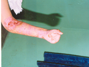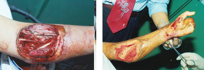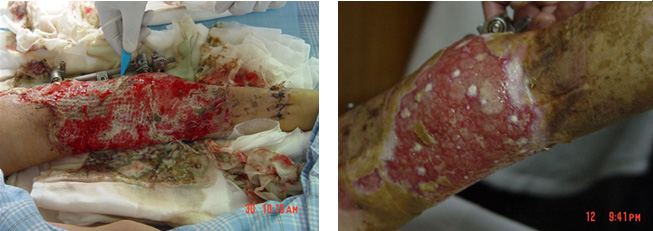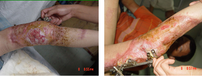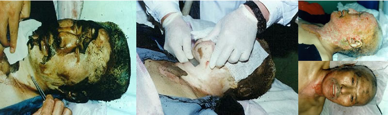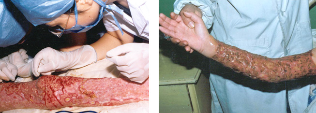 Sterilize the peripheral healthy skins around the wounds with routine methods and clean the sewage on the wounds with physiological saline water directly. The smear MEBO wound ointment onto the wounds. Continue with the treatment of BRT with MEBT/MEBO until the wounds regenerate and heal. For minor wounds, apply MEBO dressing until the regenerative healing.