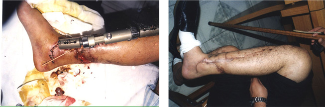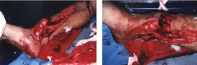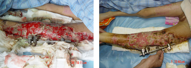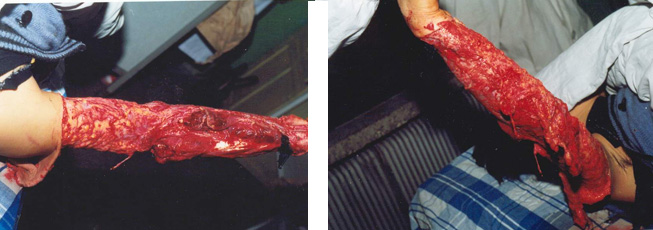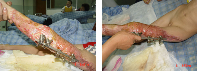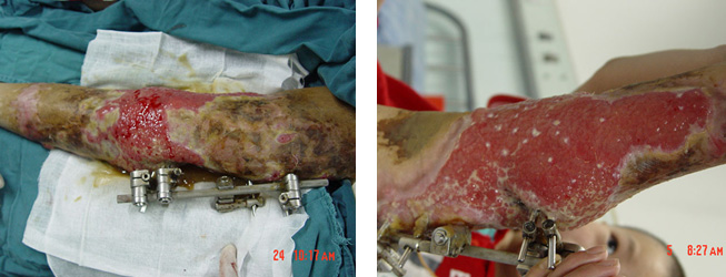 患兒、男、8歲,2007年3月17日下午10點因汽車碾傷9小時入院。入院診斷:1、失血性休克,2、左股骨下段開放性粉碎性骨折,3、左下肢大面積皮膚撕脫傷伴缺如,4、盆骨骨折,左恥骨下支骨折,5、左股骨粗隆間骨折,6、左髖臼骨折,7、陰囊血腫,尿道損傷,8、胰腺損傷?9、全身多處皮膚軟組織擦挫傷。