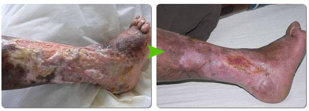 First apply MEBO wound ointment onto the wounds. Until the leakage of write effusion four hours later, the wounds are treated with BRT with MEBT/MEBO for the skin ulcers regenerative healing. If no leakage of write effusion after 4 hours, smear three times regular dosages of MEBO wound ointment onto the wounds, and then cover with MEBO dressing. 12 hours later, change the dressing. Treat with BRT with MEBT/MEBO after the leakage of the effusion, if no leakage happens, repeat the methods stated above until the leakage happening.