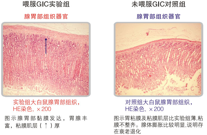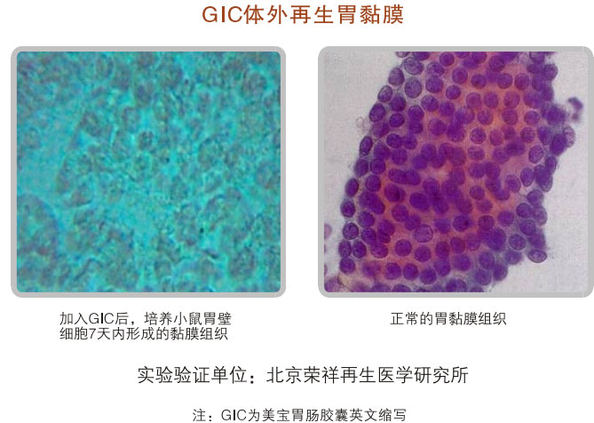 對10個月大的雄性大白鼠進行526天的胃腸器官原位再生復(fù)原的實驗證明:美寶胃腸再生復(fù)原技術(shù)可保障胃腸黏膜及相關(guān)腺體組織、平滑肌肌層旺盛的活力,未使用美寶胃腸再生復(fù)原技術(shù)對照組的實驗結(jié)果是胃腸黏膜萎縮、老化明顯、腺體明顯減少、平滑肌層變薄。