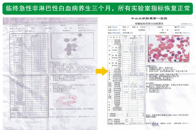 另一位患者是白血病,大家知道白血病比較可怕,但對于我們的養(yǎng)生來說,又顯得不是那么可怕。我們做的動物實驗中可以讓骨髓再生。我們用鈷60的照射破壞骨髓,無論怎么破壞,通過讓骨髓再生,動物的骨髓都可以保持健康,凡是沒有吃再生物質(zhì)的則繼續(xù)惡化。這位患者醫(yī)院診斷為白血病,已經(jīng)多次復(fù)發(fā),醫(yī)院對這位患者已經(jīng)放棄了醫(yī)學(xué)治療。1月底加入我們的癌癥養(yǎng)生計劃。到3月3號檢查,她的骨髓已經(jīng)變成正常的了,其身體現(xiàn)在和正常人一樣。