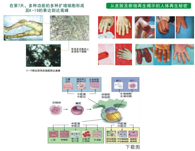 我們從皮膚和斷指再生復(fù)原結(jié)果來(lái)揭示人體再生。斷指能再生嗎?世界上認(rèn)為斷指是不可能再生的。新生兒指尖少了一點(diǎn)可以再長(zhǎng),這是因?yàn)槠溥€未發(fā)育完全,但成年人就不可能再生了。不久前,美國(guó)《科學(xué)》雜志組織了很多科學(xué)家設(shè)想了將來(lái)要解決的問(wèn)題,其中就有斷指再生。可是我們已經(jīng)把它變成了現(xiàn)實(shí),我們也不是先發(fā)現(xiàn)了再生后才有了斷指再生,也不是由燒傷的皮膚再生想到了指頭再生,而是在試驗(yàn)中才發(fā)現(xiàn)了這個(gè)斷指再生的現(xiàn)象。我在以往的實(shí)驗(yàn)中發(fā)現(xiàn)環(huán)境決定了器官的修復(fù)程度,但起初并沒(méi)有聯(lián)想到再生,后來(lái)才在細(xì)胞試驗(yàn)中發(fā)現(xiàn)愈合傷口的細(xì)胞有差異,我就開(kāi)始認(rèn)為這是再生細(xì)胞造成的,經(jīng)過(guò)做實(shí)驗(yàn),最后發(fā)現(xiàn)了斷指也可以再生。我們的這個(gè)斷指再生是再生復(fù)原,恢復(fù)得和受傷前一模一樣,而不是他們說(shuō)的普通愈合。我從這個(gè)聯(lián)想到人的肢體,這個(gè)手指頭和人的腿,胳膊是一樣的,都有血管、神經(jīng)、骨頭、肌肉、皮下組織等各個(gè)組織與器官。不要看這些部位它們大小相差很大,但組成指頭和腿的四大組織神經(jīng)組織、肌肉組織、結(jié)締組織、上皮組織是一樣的,而指頭的組成組織比腿還要多。人雖然至少有60萬(wàn)億個(gè)細(xì)胞組成,但可以都劃分到這四大類之中。所以我就從這指頭的再生聯(lián)想到人的其他器官和組織的再生,考慮到它們?cè)谂咛r(shí)的關(guān)系,這個(gè)意義就大了。大家知道(如圖示各個(gè)胚胎發(fā)育結(jié)果)胚胎的三個(gè)胚胎層產(chǎn)生的器官不同,按一般的理論,人的器官損壞了要想再生,必須走從胚胎到這些器官的發(fā)育過(guò)程,可是我們沒(méi)有這么做,就實(shí)現(xiàn)了器官再生。這個(gè)結(jié)果就把傳統(tǒng)的生命科學(xué)常識(shí)顛覆了,無(wú)論那些生命科學(xué)家的經(jīng)驗(yàn)多好,資料多豐富,在我們這里都用不上了,我們沒(méi)有任何經(jīng)驗(yàn)和規(guī)律可借鑒,只要按發(fā)現(xiàn)的規(guī)律向前實(shí)踐,這也是我們?yōu)槭裁匆⑷梭w再生復(fù)原科學(xué)的原因。