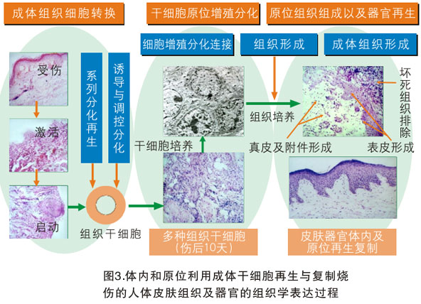 人類(lèi)組織與器官體內(nèi)和原位再生、復(fù)制的圖譜具有代表性,而不同的組織器官有各自的圖譜,我們將于近期公布。圖3顯示的是燒傷的人類(lèi)皮膚組織器官體內(nèi)和原位利用干細(xì)胞再生和復(fù)制的組織學(xué)表達(dá)過(guò)程。