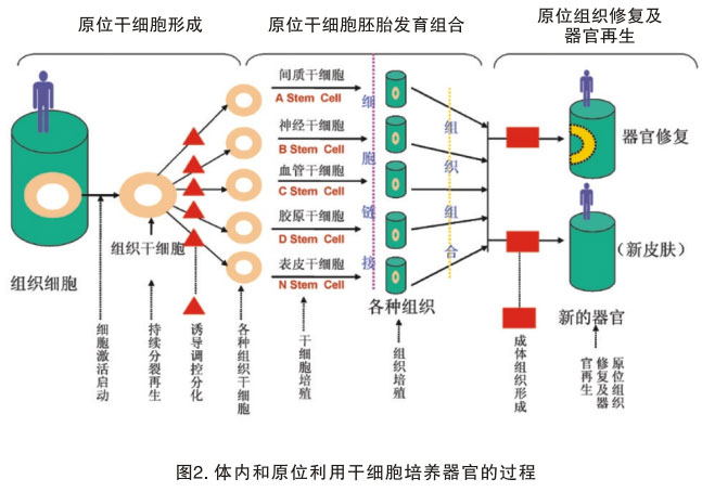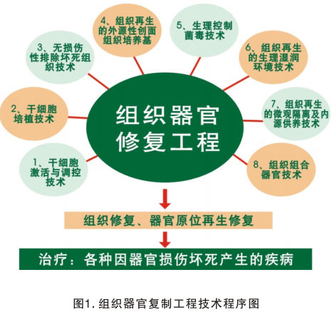 燒傷再生療法是目前唯一能在體內(nèi)和原位培養(yǎng)干細(xì)胞來(lái)成功修復(fù)與克隆器官的技術(shù)。相信該技術(shù)能盡早揭開(kāi)人類(lèi)生命體延續(xù)之謎。繼成功克隆人體最大器官皮膚后,其他器官的克隆過(guò)程將很快被證實(shí)。2002年5月28日,我公布了一項(xiàng)研究成果,人類(lèi)組織器官再生復(fù)制圖譜,并申請(qǐng)了專(zhuān)利。美國(guó)網(wǎng)站www.stemcellresearchnews.com對(duì)這一重大事件做了大篇幅報(bào)道。圖譜客觀地再現(xiàn)了細(xì)胞修復(fù)損傷組織,的確是分化和整合的過(guò)程。第一,機(jī)體受傷,存活細(xì)胞原位啟動(dòng),形成成體干細(xì)胞。第二,成體干細(xì)胞被誘導(dǎo)并定向分化為各種組織的干細(xì)胞,將最終完成組織修復(fù)。第三,新生組織產(chǎn)生,再生的組織干細(xì)胞與新生組織連接。最后,各種新生組織組合成器官受損部分,形成新的功能組織器官,進(jìn)而實(shí)現(xiàn)體內(nèi)和原位靶組織器官的修復(fù)與再生(圖2)。