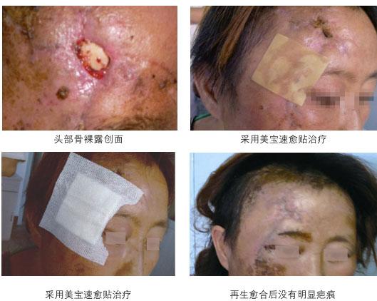 地震期間,因高處掉落的磚、石砸傷頭部,導(dǎo)致皮膚軟組織缺損,在這些地震傷員的救治中,直接用再生方法,使大量的皮膚軟組織缺損的創(chuàng)傷口才再生愈合,不需植皮。(參見圖3)