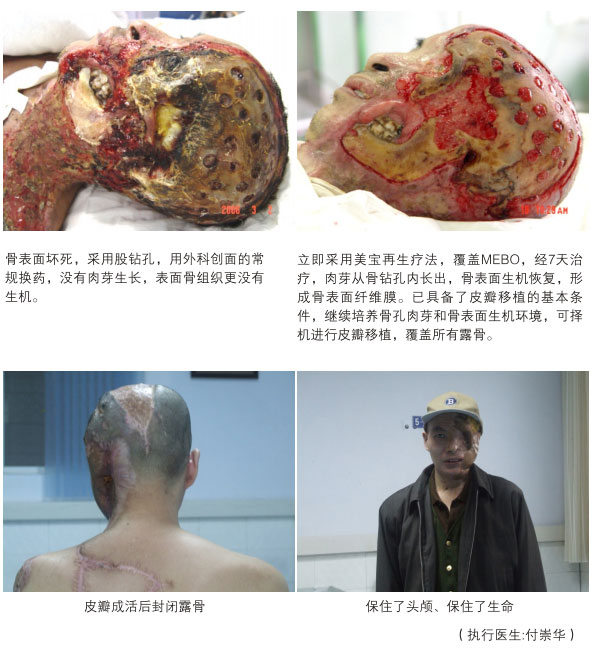 2. 壞死面、顱骨的重新原位再生:這項(xiàng)臨床應(yīng)用技術(shù)已成為再生治療的常規(guī),現(xiàn)舉例說明,患者左側(cè)頭部電爐烤傷,軟組織焦化,面顱骨大部分壞死,醫(yī)院開始用外科方法治療,將顱骨和面部骨骼鉆孔,見鉆孔深度的骨組織壞死,沒有肉芽長出。無奈之際,采用再生療法,經(jīng)一周的再生復(fù)原療法治療,鉆孔處肉芽再生出來,壞死的骨組織復(fù)原,原位再生出骨膜。從而創(chuàng)造了皮瓣移植的條件,最終救活患者。(參見圖5)