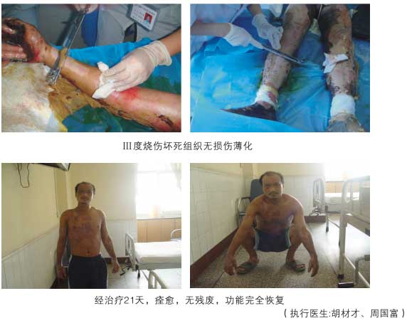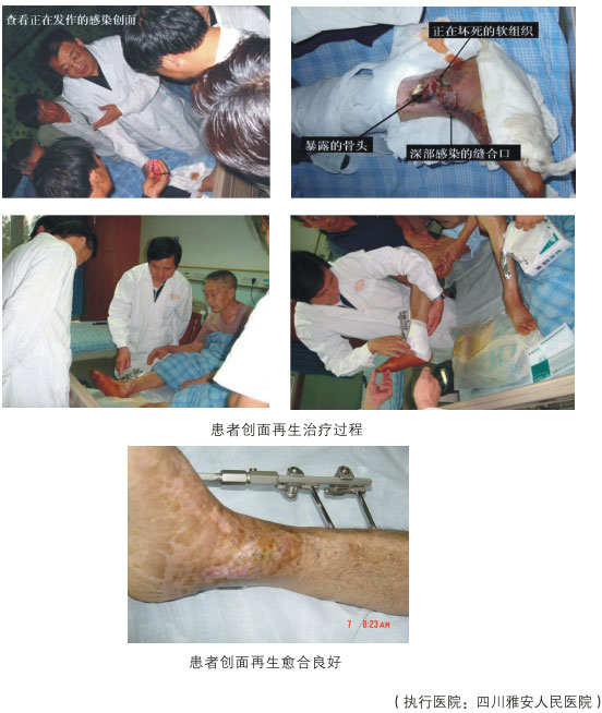 2008年四川地震再生復(fù)原治療的開放性創(chuàng)傷患者152例全部再生愈合(不包括小的傷口),沒有一例截肢,如某些按西方專家提出截肢方案準(zhǔn)備截肢的患者,改用再生療法,沒有截肢,并在兩周后患者創(chuàng)面再生愈合出院。同時(shí),我們的醫(yī)療組織承擔(dān)全部燒傷患者的救治,最大深度燒傷面積99%,全部皮膚再生,零死亡,零殘廢。