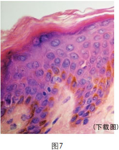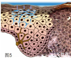 世界上化妝品無論配方如何,這些外源性化妝品都很難進入到真皮。之所以這么說,是因為在基底細胞層下面有一個膜(圖7),這個膜不僅是為了表皮與真皮的連接,這也是解決皮膚器官再生復(fù)原的一個最重要的技術(shù)環(huán)節(jié)。這個基底膜具有半通透性,在皮膚和斷指再生治療技術(shù)上,我們仿生了這個膜,這層膜的下面有血管、神經(jīng),但血管過不了這層膜。如果你的皮膚一旦出血,就說明是這層膜破了。我們看到的血絲,都是在基底膜之下的,除非異常的血絲,有些病變的可以突出到基底膜之上。正常的生理情況下,血管都在基底膜下,膠原纖維也在基底膜下,纖維無法通過,唯一能通過的是神經(jīng)末梢。(圖8)神經(jīng)延伸到基底膜,基底膜外面還有一層膜包繞在神經(jīng)外面,一但穿過了這個膜就成了沒有膜包繞的纖維,叫神經(jīng)纖維的暴露端,所以膜上面除去表皮的四大層,還有一些無包膜的神經(jīng)末梢纖維。因此觸摸的時候會出現(xiàn)感覺。
