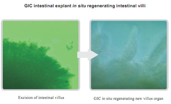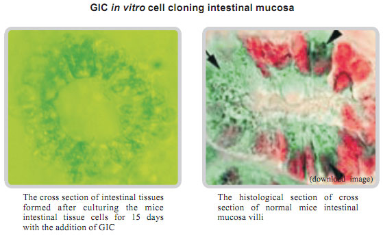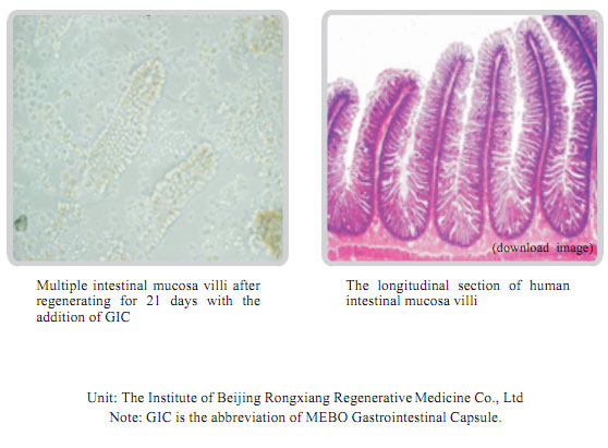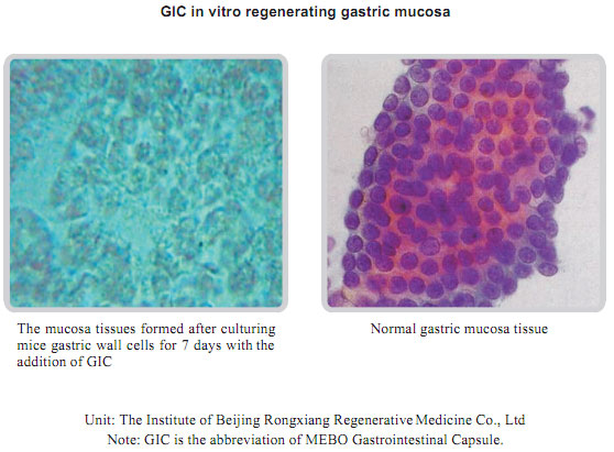 The experimental animal: 10-month-old male albino rats with the average life of 480 days. The experiment lasted for 526 days. The experiment proves: MEBO Gastrointestinal Regenerative Restoration Technique (including MEBO GIC) can maintain the vigorous life of the gastrointestinal mucosa, the related gland tissues, muscular layer of the smooth muscle. However, animals without the administration of GIC show: the atrophy of gastrointestinal mucosa, obvious aging, obviously decreased numbers of glands, thinning of muscular layer of smooth muscle.