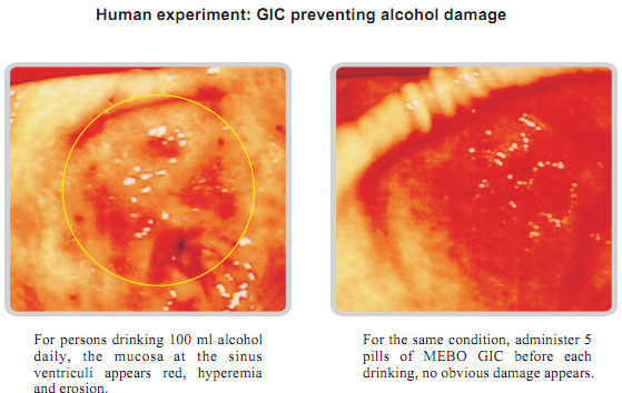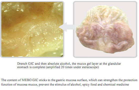 After the components of MEBO GIC enter the gastrointestinal tract, the components will mix with mucus and form more solid protection layer to prevent the stimulus by food, gastric acid and other destroying factors. If injury occurs, the components will search it immediately and adheres to the damaged surface because of their high affinity. Then a protection layer will form to prevent secondary damage. So this product can not only protect gastrointestinal mucosa from damage, but also assure the normal digestion and absorption.