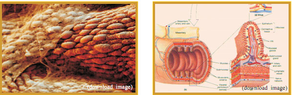 The upper right picture is the schematic diagram of the structure of intestinal mucosal villi. The mucosa is formed by the villi (serrate bulges) and every villus can absorb the nutrients independently.