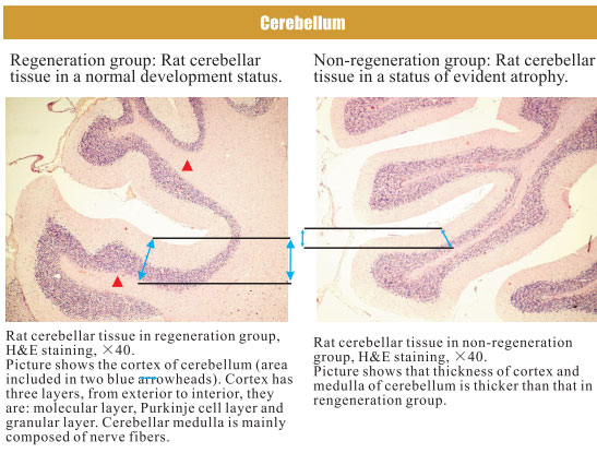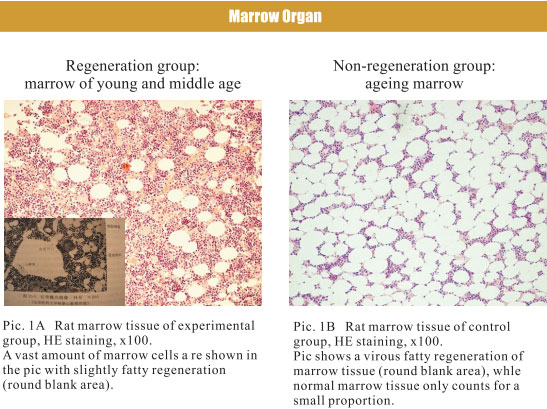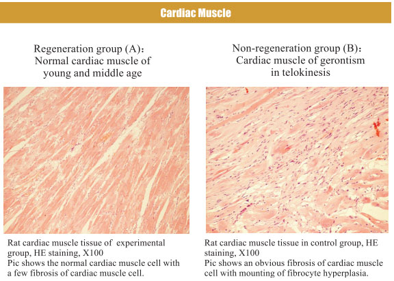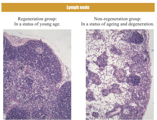 Laboratory rats were reared in a standard environment growing to 300 days old (beginning of the aging), then were divided into two groups, one was test group (regenerative nutritional group) fed with standard nutritional food mixed with regenerative substances; the other was control group (non-regenerative nutritional group) fed with the same standard nutritional food, plus the same amount of water instead of regenerative substances. Continue to rear them in standard environment.