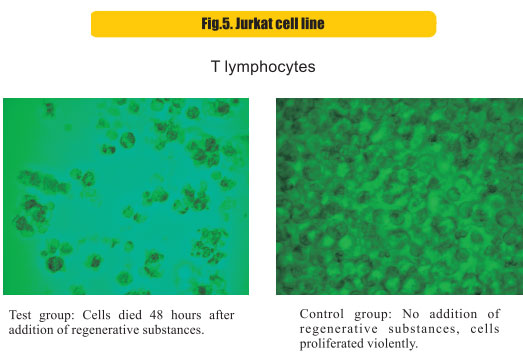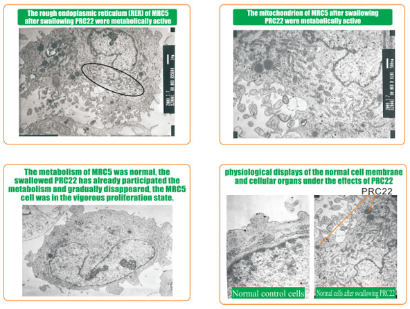 The result was as follows: after the normal cells swallowed the regenerative substances, metabolism of the cell organelles was stimulated, nuclei divided actively, regenerative substances were exhausted by metabolism; however, no obvious proliferation occurred to normal control lung cells without presentation of regenerative substances.  After lung cancer cells swallowed the regenerative substances, metabolism of organelles of cells stopped on the instant; on the first day, pseudopodia of cells broke, mitochondrion swelled and died, chromocenters contracted, metabolism and exhaustion did not happened to the phagocytized regenerative substances, and cells died in apoptosis on the second day with no changes for phagocytized regenerative substances.