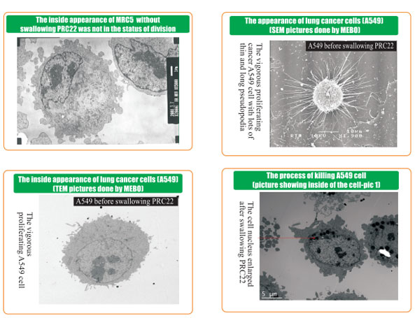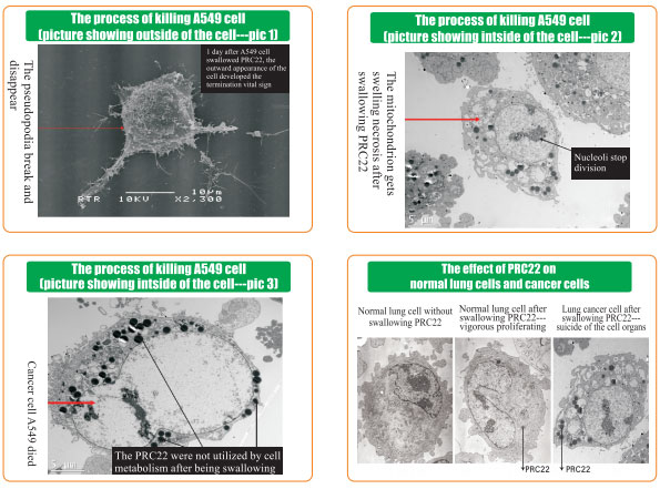 These results indicated that for normal control lung cells, regenerative substance was a kind of regenerative nutrition; while for cancer cells, regenerative substance was fatal.  The results also showed that regenerative substances acted first in cytoplasm, then in nucleus.  This will probably be a new approach for us to overcome cancer. (See pictures of electron microscope)
