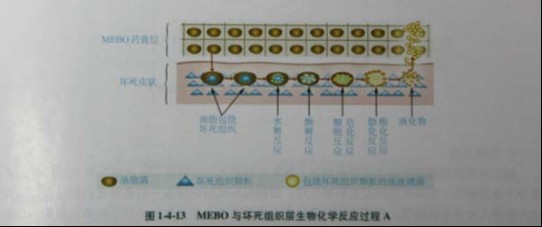 壞死組織的液化是在MEBO的作用下,使固態(tài)的燒傷創(chuàng)面壞死組織轉(zhuǎn)化為液態(tài),并從創(chuàng)面上排除的過程。詮釋燒傷創(chuàng)面壞死組織液化過程之前,應(yīng)首先了解MEBO特有的低熔點(diǎn)框架劑型的藥理作用。框架劑型是隨著溫度變化而改變的可變劑型,在常溫下呈軟膏形態(tài)。外涂于燒傷創(chuàng)面后,由于皮膚溫度的作用而液化,使1mm厚的藥膜形成兩層:暴露在空氣中的表層為膏態(tài),接觸創(chuàng)面層的為液態(tài)。由于MEBO具有親脂性,因液態(tài)部分的藥物與創(chuàng)面壞死組織相互作用而失去了親脂性,并與創(chuàng)面的滲出物、液化物相互混合,爾后向藥層外移動(dòng),以至沖破藥膜而排出。上層的藥物成分在皮溫的作用下,持續(xù)供給液層,液層的藥物又不斷地與創(chuàng)面壞死層發(fā)生水解、酶解、酸敗、皂化、脂化和酯化等多種生物化學(xué)反應(yīng),循環(huán)往復(fù),自動(dòng)引流,上述反應(yīng)過程即是促使創(chuàng)面壞死皮膚組織從固態(tài)轉(zhuǎn)化為液態(tài)的主要機(jī)制。由于新鮮的MEBO 藥膏不斷供給創(chuàng)面,在發(fā)揮無損傷液化排除壞死組織功能的同時(shí),促進(jìn)創(chuàng)面皮膚再生復(fù)原(圖1-4-13)。