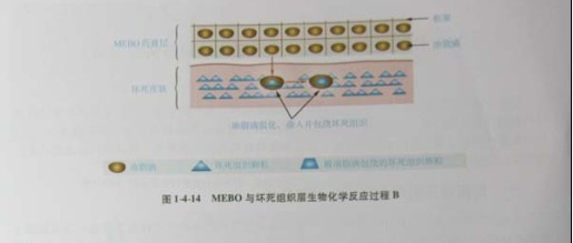 首先是MEBO中具有油脂性質(zhì)的基質(zhì)在創(chuàng)面溫度的溫化下,由固態(tài)的軟膏劑型轉(zhuǎn)化為液態(tài),溫化的油滴滲入創(chuàng)面,將壞死皮膚組織分割為顆粒并將其包繞,從而啟動(dòng)壞死組織連續(xù)發(fā)生系列的生化反應(yīng)(1-4-14)。