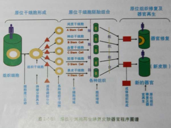 從原位干細(xì)胞再生復(fù)原皮膚器官程序圖譜中看出,皮膚原位再生復(fù)原技術(shù)包括三個方面:一是原位激活啟動潛能再生細(xì)胞,促進(jìn)其形成干細(xì)胞;二是原位干細(xì)胞的組織組合;三是皮膚組織器官的再生組合。