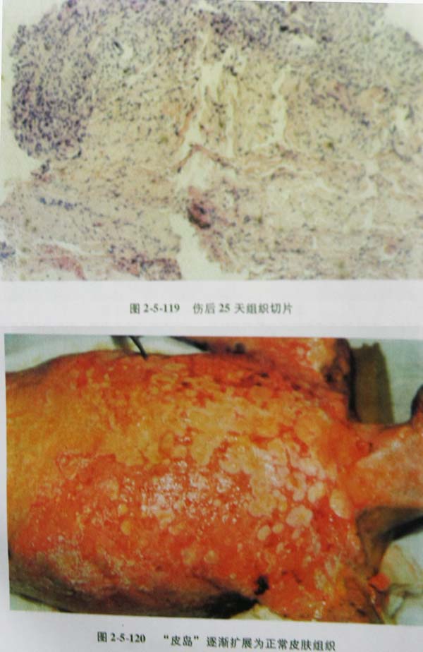 Ⅲ度淺型燒傷皮膚全層壞死,故治療后創(chuàng)面暫無滲出,第3天始見創(chuàng)面壞死組織層表面有白色液化物,第5天液化物開始增多,創(chuàng)面壞死層一般在傷后第2535天能完全液化。創(chuàng)面基底自第3540天后漸向皮面凸起,創(chuàng)面肉芽化,部分肉芽創(chuàng)面由創(chuàng)緣上皮向中心蔓延,創(chuàng)面縮小。創(chuàng)面邊緣上皮蔓延的同時,肉芽組織表面出現(xiàn)散在上皮點,并逐漸擴(kuò)散,互相融合,封閉創(chuàng)面。