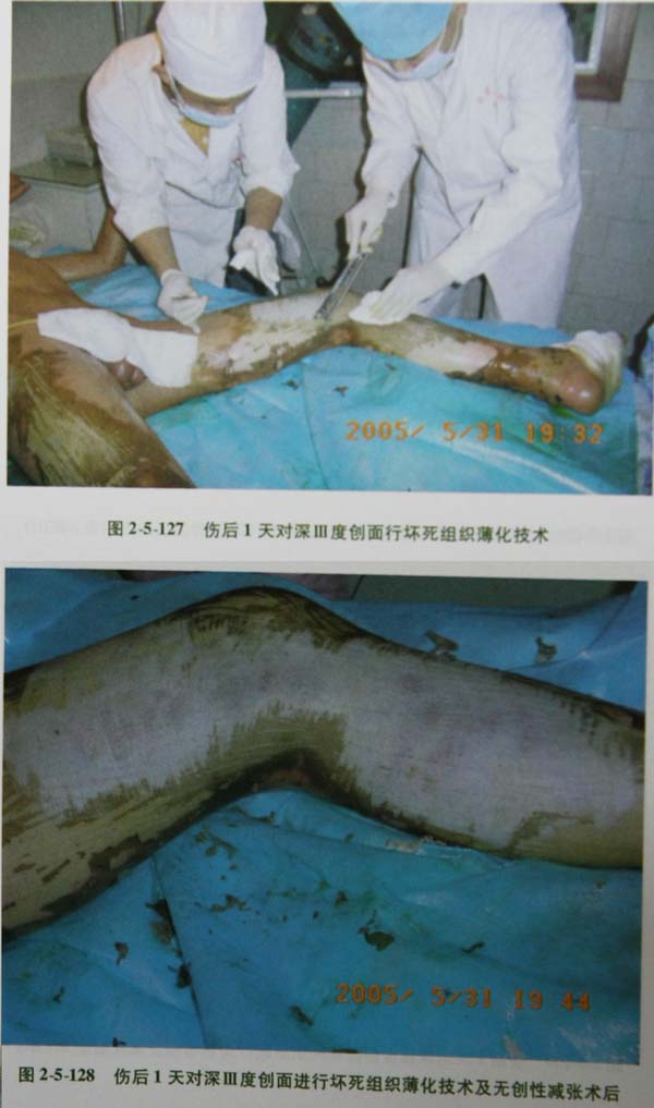 1)焦黃或炭化,焦痂質(zhì)硬干燥、涼,不治療或采用干法治療者,傷后12天透過焦痂可見栓塞的粗大血管網(wǎng)或切開焦痂見肌肉紫暗無收縮性或關(guān)節(jié)、骨骼外露。