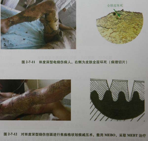 此療法適用于淺筋膜組織及全層皮膚壞死的Ⅲ度深型燒傷創(chuàng)面初期治療。目的,行焦痂格狀劃痕減壓術(shù),可將壞死皮膚打開,松解減壓,可促使皮下組織淤滯帶瀕死組織得以恢復(fù)生機,為植皮打下好基礎(chǔ)。