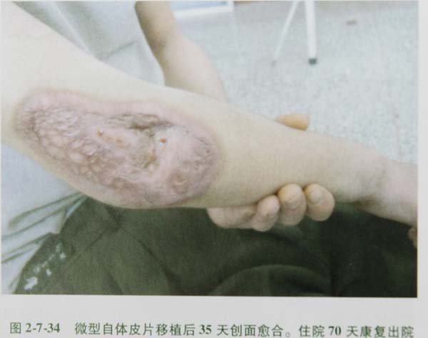 3)一般在1015天即可見(jiàn)暴露骨骼的鉆孔部位長(zhǎng)出肉芽組織,此種肉芽組織在MEBO的作用下逐漸擴(kuò)展以至覆蓋暴露的骨關(guān)節(jié),術(shù)后2025天肉芽組織長(zhǎng)滿,可行自體皮簇內(nèi)植術(shù)治療。此為關(guān)節(jié)擴(kuò)創(chuàng)肉芽培植術(shù)階段。對(duì)已經(jīng)植皮成活的創(chuàng)面繼續(xù)應(yīng)用MEBO外涂,可促進(jìn)皮片伸展愈合并可減輕疤痕的生成,保證肢體功能的恢復(fù)。