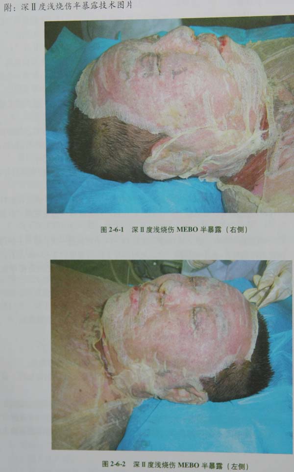 2大面積燒傷病人可先向創(chuàng)面涂一層MEBO,再在無(wú)菌床單上放置兩層無(wú)菌紗布。仰臥位使創(chuàng)面貼于無(wú)菌紗布上。間隔812小時(shí)更換一層MEBO,換藥時(shí)將藥紗、腐皮及創(chuàng)面液化物揭去,使創(chuàng)面清潔,再繼續(xù)涂藥敷紗布,達(dá)到通暢引流目的。這樣反復(fù)進(jìn)行,直至創(chuàng)面愈合。