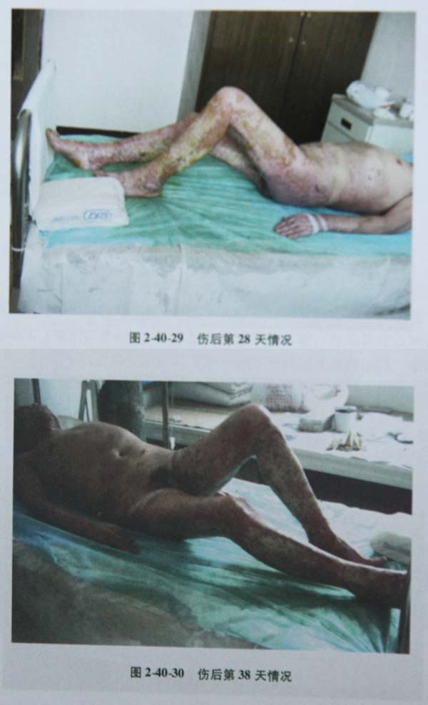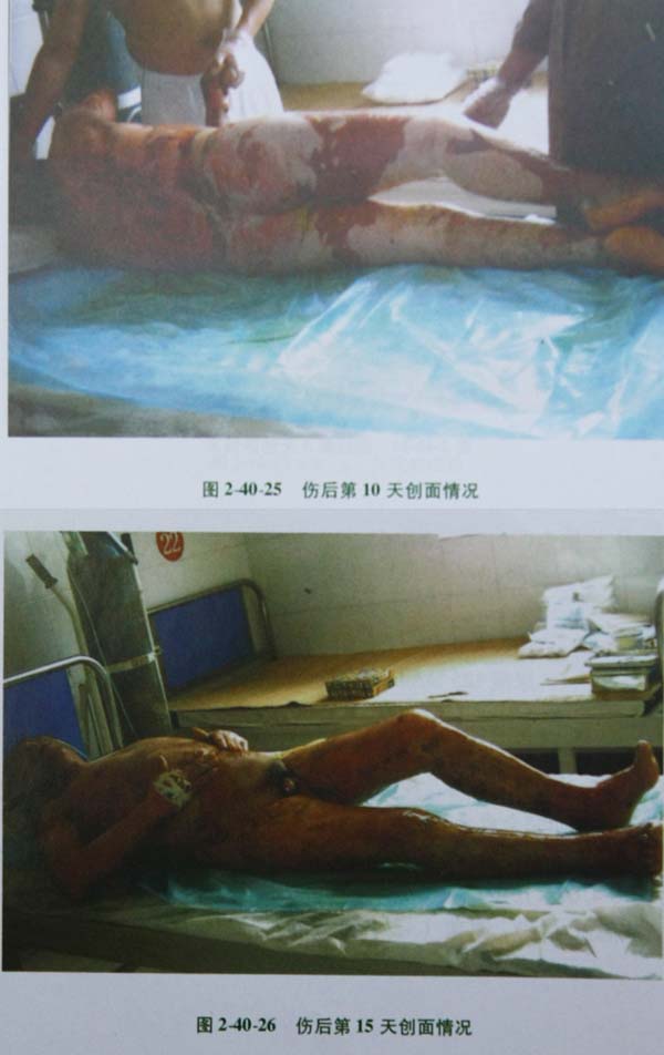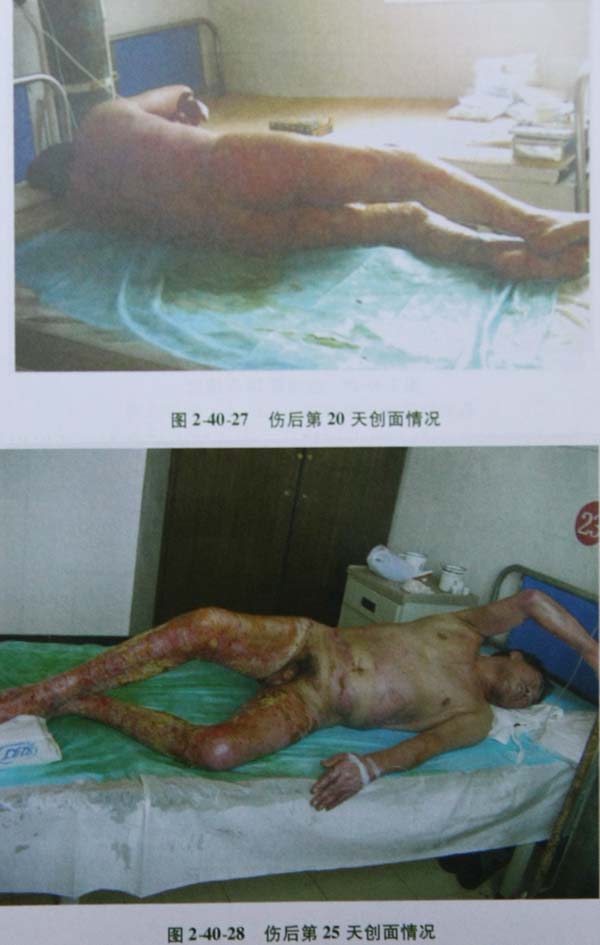 傷后第25天,患者一般情況良好,停用磷霉素、丁胺卡那霉素靜脈點滴,大部分深Ⅱ度深型創(chuàng)面已愈合,Ⅲ度淺型(雙大腿內側、小腿)創(chuàng)面有大量壞死組織,結合外科清創(chuàng)手段,逐步將浮動的壞死組織清除。同時囑患者加強雙下肢和膝關節(jié)的功能鍛煉。