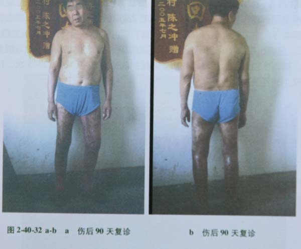 出院后30天(傷后90天)復診,愈后皮膚彈性好,深Ⅱ度未見明顯疤痕,Ⅲ度淺型有少量軟瘢痕,不影響膝關節(jié)功能,雙下肢有部分色素脫失。生活能自理,可參加正常的體力勞動。