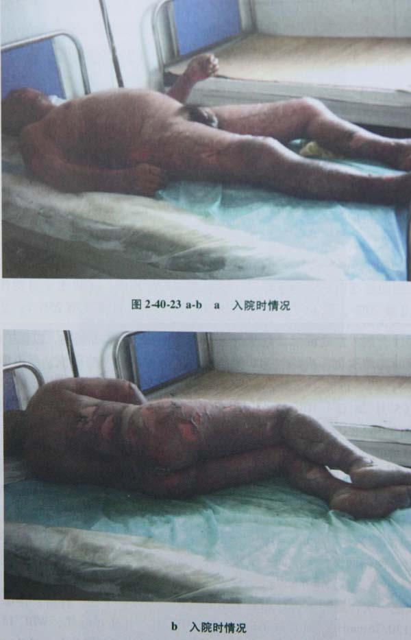 [病例2]患者陳××,男,55歲,江蘇省鹽城市射陽縣耦耕鎮(zhèn)解放村7組,浴室鍋爐工,因沸水燙傷周身3小時急診入院。患者于2005年5月28日中午,因工作時不慎滑入浴室沸水池內,掙扎3次約10秒鐘才從池中爬出,在就近一家醫(yī)院予以中藥油紗布包扎,并輸液治療(具體用藥不詳),3小時后轉入我院,途中訴口渴、無小便。入院體檢體溫355℃,心率110次/分,呼吸32次/分,血壓70/40mmHg,神志尚清,精神緊張,煩躁,呼吸稍急促,四肢厥冷,兩肺呼吸音粗,未聞及干濕性啰音,心率110次/分,律齊,未聞及明顯雜音,全身紗布包扎,打開敷料,見約有90%TBSA皮膚燙傷,創(chuàng)面有大小不等水皰多處,部分腐皮撕脫、皺折,創(chuàng)面基底紅白相間,以白為主,雙下肢創(chuàng)面呈蒼白色,痛覺遲鈍,皮溫涼。入院診斷:①沸水全身燙傷Ⅱ—Ⅲ度總面積90%TBSA(淺Ⅱ度20%,深Ⅱ度淺30%,深Ⅱ度深15%,Ⅲ度淺型25%);②休克。入院后病房室溫控制在28~30℃,相對濕度60%左右。立即予以吸氧,迅速建立靜脈補液通道,快速補液抗休克,補液原則參照燒傷皮膚原位再生技術抗休克補液公式,膠晶比例為1∶2左右,適當調整輸液速度,將尿量控制在50~80mL/h。同時給予預防性應用頭孢他啶防治感染,并應用甘露醇,碳酸氫鈉,利尿合劑,雷尼替丁,毛花甙丙、多巴胺、654-2等藥物,以保護各臟器的功能。在作全身治療的同時簡單清創(chuàng),去除卷曲、皺折腐皮,低位剪破水皰引流,保留皰皮,Ⅲ度淺型創(chuàng)面行“耕耘減張療法”,以“不麻醉、不疼痛、不出血”為原則,然后創(chuàng)面外涂MEBO,厚度約1mm。查血常規(guī)(5月28日)RBC 672×1012/L,HGB 218g/L,WBC 386×109/L,N 85%,L 11%,M 4%,PLT 362×109/L,血型B型,尿常規(guī)正常,糞常規(guī)正常。