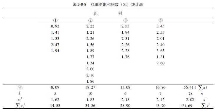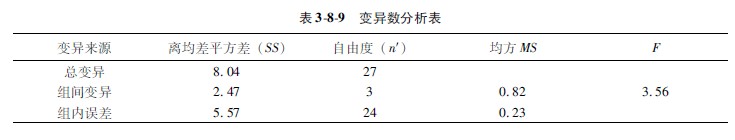 各組個體數(shù)目不同時的F檢驗方法與個體相同者基本相似,只是在計算組間離均差平方和時應(yīng)當(dāng)注意各組的分母不盡相同。以例382說明:
