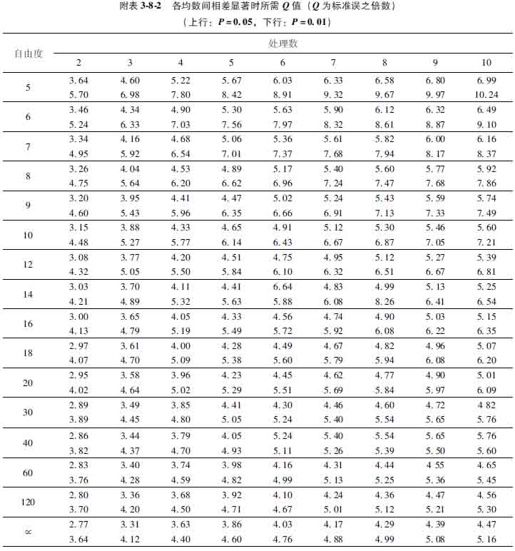 4確定各組均數(shù)相差顯著時所需Q值:結(jié)果見表3811。