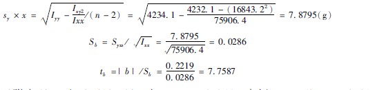查t界值表(附表4):n′=8(10-2)時,t(8)001=3355。本例t=77587,p<001, 回歸系數(shù)有非常顯著意義。