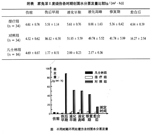 燒傷后,對照組創(chuàng)面水分蒸發(fā)量大幅度增加,可達(dá)正常皮膚的19倍,傷后6~8h以后呈逐漸下降趨勢,直至創(chuàng)面愈合以后其水分蒸發(fā)量始終未降到傷前正常皮膚的水平。濕療組創(chuàng)面水分蒸發(fā)量在傷后也立即增高,但明顯低于對照組,在早期約為對照組的1/16;此后,隨液化反應(yīng)的加強(qiáng),其創(chuàng)面水分蒸發(fā)量也隨之上升,液化高峰時其蒸發(fā)量也達(dá)高峰,而后逐漸下降;修復(fù)期蒸發(fā)量與受傷早期無明顯差異(P>0.05);創(chuàng)面愈合后水分蒸發(fā)量基本恢復(fù)至傷前正常皮膚的水平。凡士林組的創(chuàng)面水分蒸發(fā)量則始終維持在一個比較恒定的低水平上;進(jìn)入修復(fù)期后,由于大部分創(chuàng)面發(fā)生感染,蒸發(fā)量未進(jìn)一步監(jiān)測。見附表。