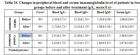 There was no significant difference in peripheral blood IgA, IgG, IgM and serum IgA levels between burns patients and normal persons (P>0.05). After treated with MEBO, peripheral blood IgA, IgG, IgM and serum IgA levels were significantly higher than those of before treatment and those in the control group and normal persons (P<0.05), while in the control group, the before and after treatment difference was not significant (P>0.05). MEBO significantly raised the levels of peripheral blood and serum immunoglobulin (Table 26).