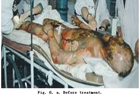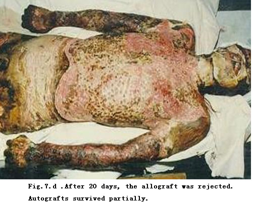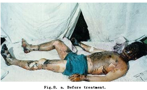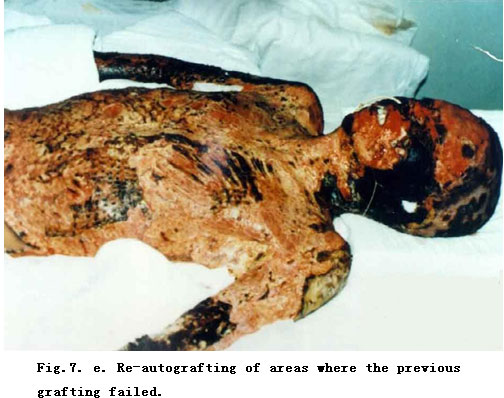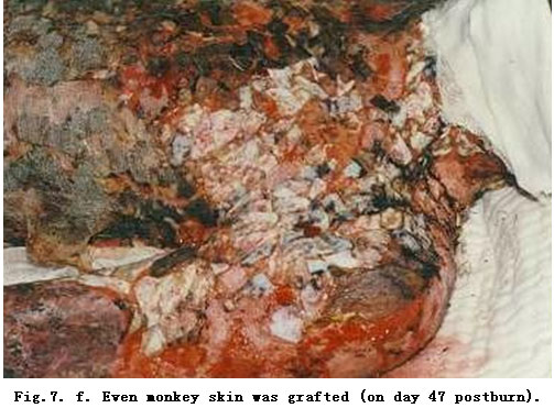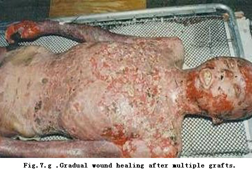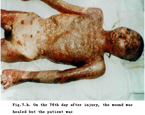 On admission, rapid fluid resuscitation was started to correct shock and tracheotomy was performed to improve ventilation. Escharectomy was then performed on the third-degree wounds of the left forearm and both legs to relieve pressure and improve blood circulation at the extremities. Superior vena cava puncturing and right cardiac floating catheterization were performed to monitor heart function. On day 2 postburn, surgical eschar excision to the underlying fascia and micro-particle autografting was performed on the extremities. On day 6, the patient received eschar excisions on the chest and abdomen, on which evenly holed allograft sheets were applied. Four days after the operation (day 10 postburn) small pieces of split-thickness autografts were placed on these wounds through the openings of the allograft. The patient developed severe Pseudomonas septicemia, and became comatose with low body temperature for 1 week. Septicemia was well controlled after intensive care. After that, repeated skin grafting was performed 9 times and most of the wounds healed. On day 43 postburn, corneal ulcer in the left eye occurred and was treated with eye drops and retrobulbar injection. Corresponding measures were taken to prevent stress ulcer, control infection and prevent pulmonary complications. The length of hospitalization was 70 days.