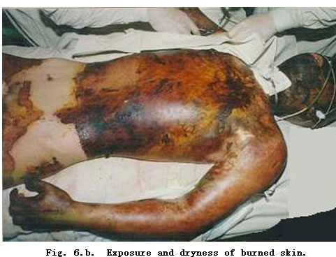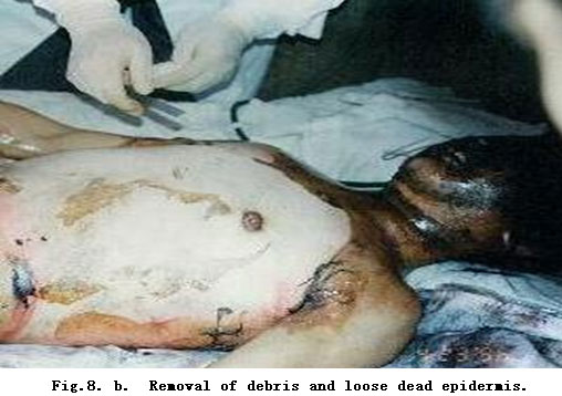 Dryness and debridement of eschar replaced the burn wound by a surgically included traumatic wound with neither burnt tissue nor skin tissue.
