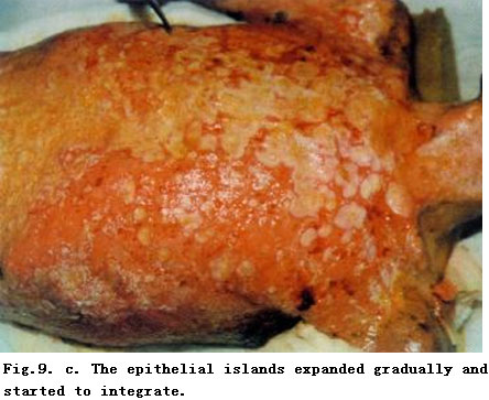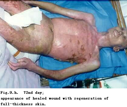 On admission, the patient was in a critical state and in shock. The extensive deep burns wounds were covered by cement powder. He had inhaled cement and his nasal hairs were singed. He suffered from respiratory abnormality and hoarseness. Tracheotomy was performed immediately. BRT with MEBT/MEBO treatment and cultivating technique was started on the wound and systemic comprehensive management begun. Histological examination of the wound skin showed third-degree burns. On day 30 postburn, liquefaction and discharge of wound necrotic tissues were finished. On day 49 postburn, newly regenerated skin was present on the wounds. Ten days later large sections of regenerated skin appeared on the wounds and all wounds had healed completely on day 72 postburn. One year later, follow-up showed the patient free of disablement, capable of independent viability and no need of reconstruction.