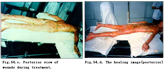 Remarkably, rigorous sterile conditions are not required if burns regenerative medicine therapy (MEBT/MEBO) is used in the care of extensive burn patients. Basic equipment and general surgical conditions typically suffice. However, ambient room temperature of 32 - 36 C and careful, well-trained, intelligent nursing care are required so that removing liquefied product in a timely manner is accomplished. In general, surgical principles of systemic comprehensive treatment should be followed. Figure 54 a-e shows Prof. Rong Xiang Xu, inventor of burns regenerative medicine and therapy (MEBT/MEBO), as he assesses and directs the treatment for a burns patient with deep burns of TBSA 100 %.