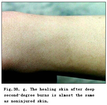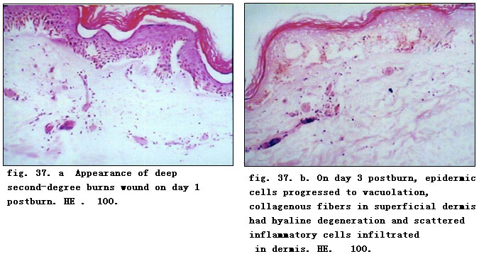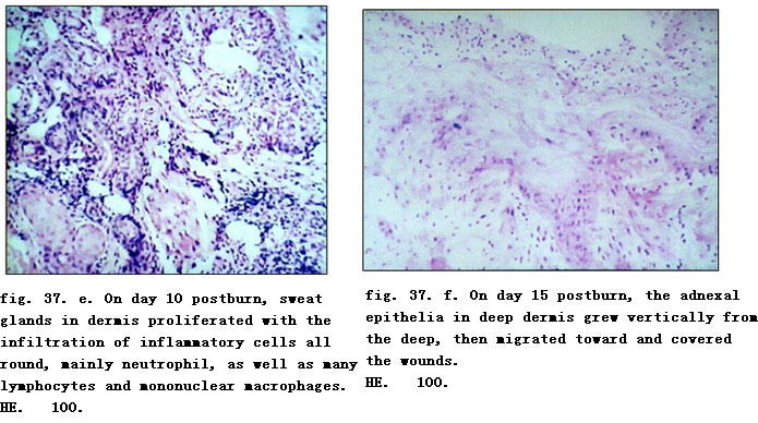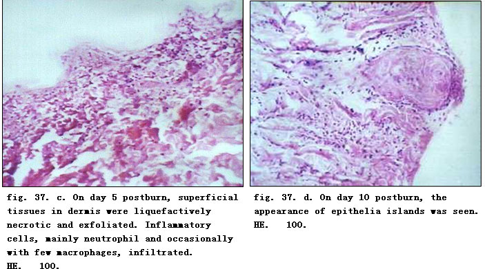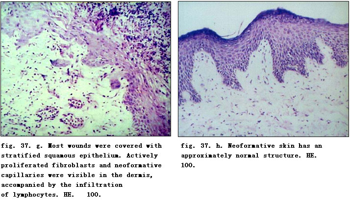 On day one postburn, epidermis became necrotic due to coagulation and necrotic basal layer cells were seen arranged in a column-fencing formation. Edema was present between epidermis and dermis. Collagenous fibers in the superficial layer of dermis were denaturated, and swollen and loosely arranged while epithelia of the dermal adnexal epithelia were also denaturated. We observed contracted nucleoli of the capillary endothelium, blood clot or stasis in lumen with little infiltration of neutrophil (fig. 37. a). Only collagenous fibers and dermal appendages in deep layer of dermis were approximately normal. On day 3 postburn, necrotic epidermal cells progressed to vacuolation with mild edema between the epidermal and dermal layers. Collagenous fibers in the superficial dermis had hyaline degeneration while in the deep tissue, the structure was loose, and blood vessels were slightly swollen with congestion. Scattered inflammatory cells (mainly neutrophils) infiltrated the tissue (fig. 37. b). On day 5 when the necrotic epidermis exfoliated, superficial tissue in the dermis liquefied and loosened due to necrosis and neutrophilic infiltration (occasional lymphocyte and mononuclear macrophages) (fig. 37. c). On day 7 postinjury, the aforementioned pathological changes became more notable. On day 10, the superficial necrotic tissue in the dermis liquefied, discharged and thinned. A large amount of neutrophils infiltrated into the liquefied necrotic tissue, interwoven with few mononuclear macrophages. The dermal adnexal epithelia in the underlying deep tissue revealed squamous metaplasia with enlarged cells, deep karyon, rich and red cytoplasm that clustered to form “epitheium island” (fig. 37. d). Among these islands, fibroblasts proliferated and were characterized by large volume of cells, conspicuous nucleolus (binucleolate was frequently present) and basophilic cytoplasm. In addition, infiltration of many inflammatory cells including neutrophil (mainly), lymphocyte and mononuclear macrophages were visible in wounds (fig. 37. e). On days 15 and 20 postburn, an inflammatory exudation layer replaced the necrotic layer whose liquefaction was now accomplished. The underlying residual adnexal epithelia, fibroblasts and endothelia showed active proliferation. The regenerated “epithelial island” grew vertically, then migrated toward and covered the wounds (fig. 37. f, g). Neoformative capillaries were noticed and granulation tissues were formed. The infiltration of inflammatory cells (mainly lymphocytes) in the dermis was still present, especially in the periphery of the regenerated skin appendages. After healing, regenerated skin appeared to be almost normal in structure and the majority of skin appendages were restored completely. Infiltration of certain inflammatory cells and few macrophages in dermis persisted (fig. 37. h).