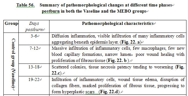According to our experimental results, in the control group there was sparse blood capillary formation with narrow lumen. The tissue was swollen with fiber proliferation and massive infiltration of inflammatory cells. The disruption of collagen fiber and absence of regenerated epidermis to cover wounds eventually resulted in wound healing by eschar (showed in Fig. 22. d). In the experimental group treated with MEBO, residual skin appendages regenerated into epidermis with multilayers and large nuclei that progressed and covered the wounds (Fig. 23. b-d). Granulation tissue was promoted into regenerative tissue; neoformative blood capillaries were enhanced more than in the control group with larger lumen and richer blood supply, both of which facilitate an enhanced metabolism (Fig. 23. a). Finally, wounds in the experimental group were covered by squamous epithelia and healed without scarring (Fig. 23.g). We noted that when burns wounds were treated by BRT with MEBT/MEBO, the perpetually changing cells began to divide and proliferate toward the wound center along the wound edges or the basal part of residual epithelia, whereas after burns injury, the stable cells residing in skin appendages and grandular epithelium were activated to divide and regenerate into epidermic tissue that in turn migrated toward and finally closed the wound. Pathological examination on days 10-12 postburn showed a transitional migration from skin appendages to regenerated epithelia. When epithelia proliferated and divided, wounds were covered by stratified squamous epithelium. The macroscopic appearance of healed wounds was initially in red or pink and progressively became normal in color.