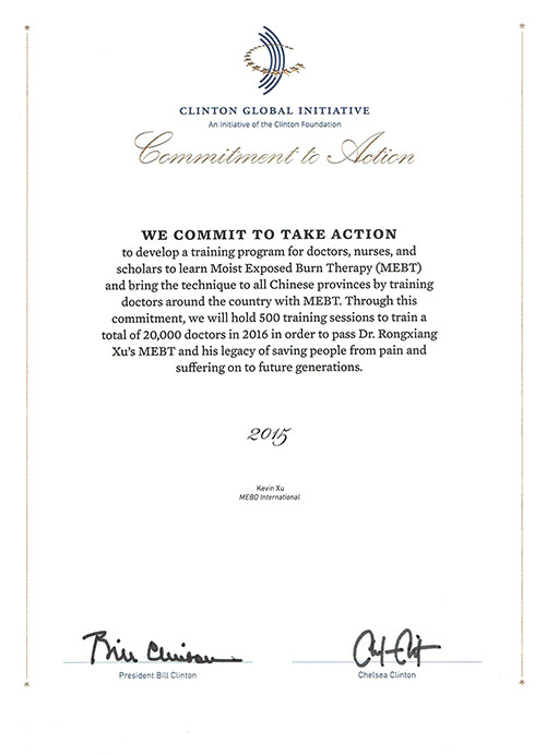 “我們承諾實(shí)施燒傷濕潤(rùn)暴露療法培訓(xùn)項(xiàng)目,將該技術(shù)推廣到全國(guó)各個(gè)省份,為醫(yī)生、護(hù)士以及學(xué)者提供濕潤(rùn)暴露療法的培訓(xùn)。我們承諾,在2016年將會(huì)開辦500個(gè)培訓(xùn)班,培訓(xùn)2萬(wàn)名醫(yī)生,將徐榮祥大夫的濕潤(rùn)暴露療法以及其救死扶傷的精神傳承。”