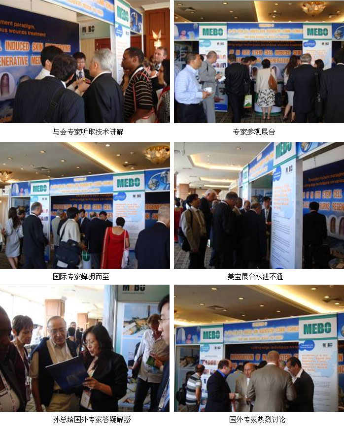 在大會主題發(fā)言后,各國專家紛紛來到美寶展臺參觀學(xué)習(xí)。大面積燒傷的完美愈合、各種久治難愈創(chuàng)面的成功救治,以及斷指再生等再生科學(xué)成就深深吸引并震撼了眾多與會代表,他們?nèi)琊囁瓶柿肆私馊梭w原位復(fù)原再生科學(xué)的奧秘,最多的時(shí)候,很多專家一擁而上瘋搶再生醫(yī)學(xué)的資料。同時(shí),我們也很高興地遇到很多已經(jīng)了解并使用過美寶的中東及東南亞的老朋友!很多已經(jīng)應(yīng)用過MEBO/MEBT的專家與美寶工作人員熱情交流,暢敘友情。表明近幾年的市場開發(fā)及醫(yī)療推廣取得了較好的成效。