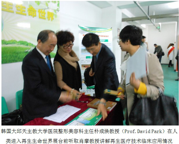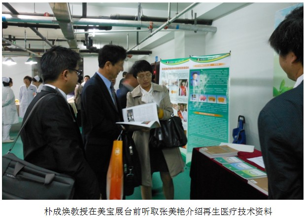 配合會議主題學術報告,北京片區(qū)專門在報告廳的門口布置了人類進入再生生命世界主題展臺,為參會的臨床醫(yī)生提供了專家咨詢交流的平臺,并贈閱學習資料,大家對《中國燒傷創(chuàng)瘍雜志》、《燒傷皮膚再生醫(yī)療技術臨床手冊》、《再生醫(yī)療技術臨床應用指導叢書》(褥瘡、糖尿病足、肛腸疾病、皮膚病、難愈創(chuàng)面等分冊),受到參會醫(yī)生的歡迎,韓國的樸成煥教授饒有興趣的到展臺前進行咨詢,他認真聽取肖摩教授講解再生醫(yī)療技術臨床應用規(guī)范和療效的情況之后,感嘆美寶的神奇療效,要結合整形美容專業(yè)應用于臨床。