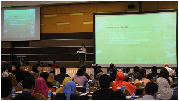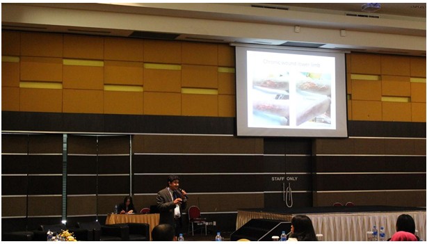 與此同時,在第二分會場,來自中國中西醫(yī)結(jié)合學(xué)會燒傷專業(yè)委員會的張美艷介紹了再生技術(shù)在難愈性創(chuàng)面治療中的顯著效果,恰當(dāng)介紹了K-19干細(xì)胞的研究成果及再生療法治療糖尿病潰瘍的研究機(jī)理,并展示了經(jīng)典的治療案例,讓每一位參會人員對再生療法的神奇療效有目共睹,嘆為觀止!有位印尼的穆斯林外科醫(yī)生表示出了極大的興趣,會后要求發(fā)送相關(guān)研究資料。