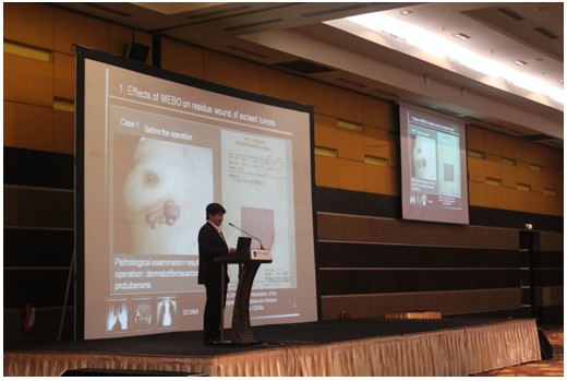 第三天會(huì)議繼續(xù)進(jìn)行,來自中國中西醫(yī)結(jié)合學(xué)會(huì)燒傷專業(yè)委員會(huì)國際部主任舒葉被安排在全體會(huì)議中第一個(gè)發(fā)言。他演講的題目是再生醫(yī)療技術(shù)在癌癥創(chuàng)面的應(yīng)用,這一世界性難題用美寶再生科學(xué)的解決吸引了所有與會(huì)代表的眼球。舒葉主任先從再生醫(yī)療技術(shù)成功治療典型病例入手,深入分析三例皮膚癌患者在手術(shù)切除、放療等治療后,殘余創(chuàng)面應(yīng)用再生醫(yī)療技術(shù)成功抑制創(chuàng)面殘余癌細(xì)胞生長的病例。然后,重點(diǎn)展示對(duì)癌癥細(xì)胞在再生物質(zhì)環(huán)境下分別培養(yǎng)和共培養(yǎng)結(jié)果的基礎(chǔ)研究。單獨(dú)培養(yǎng)的結(jié)果表明再生物質(zhì)環(huán)境下,癌細(xì)胞會(huì)快速死亡;非再生物質(zhì)環(huán)境下,癌細(xì)胞會(huì)迅速增殖分化,正常細(xì)胞會(huì)迅速被癌細(xì)胞吞噬。癌細(xì)胞和正常細(xì)胞的共培養(yǎng)結(jié)果顯示,在再生物質(zhì)環(huán)境下,正常細(xì)胞會(huì)逐漸增殖、分化形成新的組織;而在對(duì)照組中,癌細(xì)胞會(huì)迅速擴(kuò)張,正常細(xì)胞消失?;A(chǔ)研究的結(jié)果表明再生物質(zhì)具有抑制并殺死癌細(xì)胞,同時(shí)促進(jìn)正常細(xì)胞生長的雙重功效。結(jié)合臨床真實(shí)的病例展示,再生醫(yī)療技術(shù)在癌癥方面的功效及研究吸引了全體與會(huì)人員的關(guān)注。會(huì)后,多名醫(yī)生詢問具體情況,并索要相關(guān)論文,要在當(dāng)?shù)亻_展使用。
