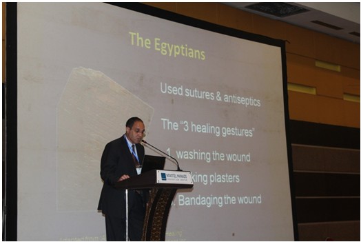隨后,來自埃及的亞歷山大大學(xué)外科教授和再生醫(yī)學(xué)專家Dr. Sakr, 再次受邀登上大會(huì)的講臺(tái),講述在埃及創(chuàng)面治療的歷史和未來趨勢(shì)。Dr. Sakr,博古通今,旁證博引,系統(tǒng)地介紹了從古至今的各種創(chuàng)面療法,包括用蜂蜜,茶葉,植物油等的應(yīng)用;重點(diǎn)論證了濕性療法的合理性和優(yōu)勢(shì),并將再生療法列入關(guān)鍵的創(chuàng)面治療發(fā)展史,展示了各種創(chuàng)面的對(duì)癥處理,并結(jié)合創(chuàng)面的生理及病理變化過程講解了再生療法。最后,他指出再生療法是創(chuàng)面治療的未來和趨勢(shì)。