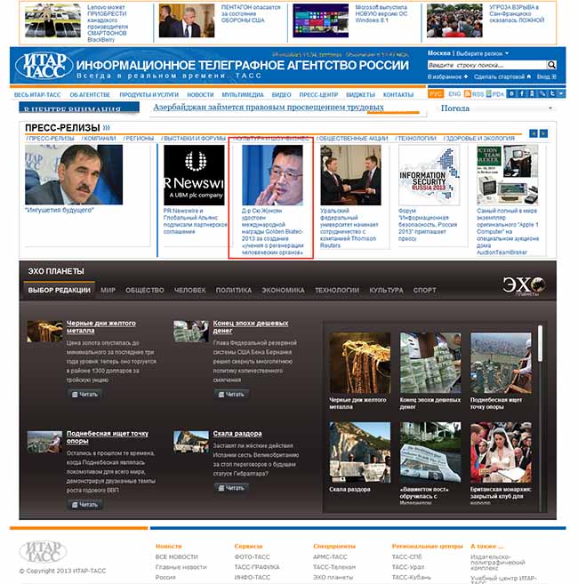 徐榮祥教授喜獲歐洲斯洛伐克Informal Economic Forum (IEF) 經(jīng)濟俱樂部頒發(fā)的2013年“Golden Biatec”國際獎,引發(fā)國際關注熱潮,不僅美國等美洲國家高度重視,亦對歐洲俄羅斯等國引發(fā)強烈沖擊。徐榮祥獲獎新聞登于塔斯社新聞網(wǎng)站首頁一整天,成為俄羅斯等國當日重大新聞報道,引發(fā)數(shù)百萬人關注及熱議。