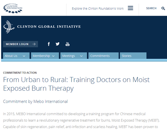 今年9月27日,比爾•克林頓和切爾西•克林頓主持召開了2015全體會(huì)議的開幕式,CGI官網(wǎng)隨即正式公布了今年其成員做出的所有承諾,其中出現(xiàn)了第一個(gè)推廣來自中國的醫(yī)療技術(shù)的倡議承諾--CGI委員徐鵬總裁帶來的美寶國際和中國中西醫(yī)結(jié)合學(xué)會(huì)燒傷專業(yè)委員會(huì)聯(lián)合發(fā)起的克林頓全球倡議行動(dòng)承諾:“從城市到鄉(xiāng)村:燒傷濕潤暴露療法醫(yī)師培訓(xùn)”,一年2萬人的計(jì)劃。27號(hào)CGI正式公布該承諾,對于美寶國際徐鵬總裁來說是一件非常有紀(jì)念意義的事情,這一天正好是他27歲的生日,同時(shí)又是中國的中秋佳節(jié)。 天時(shí)、地利、人合,美寶的前途無限光明!