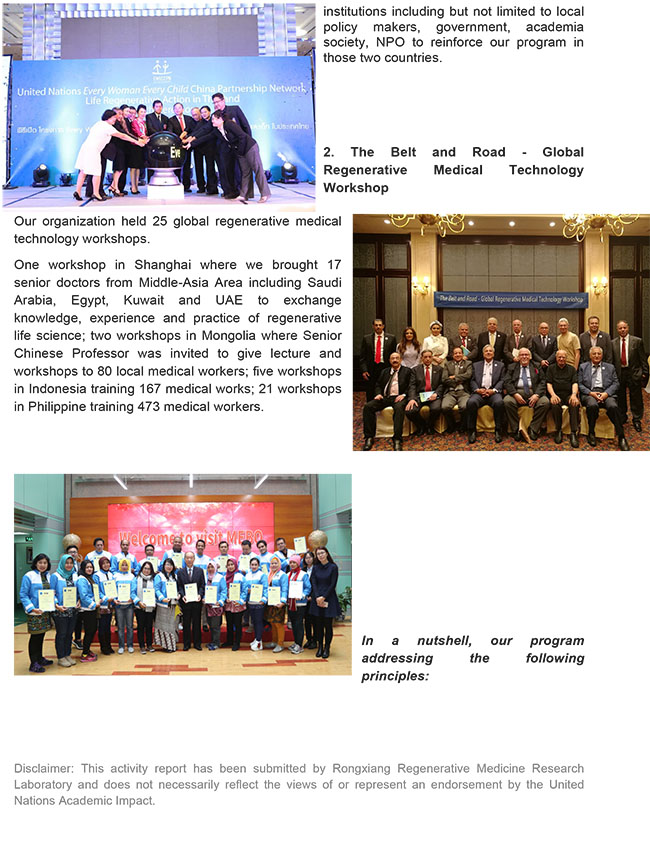 自2016年7月,北京榮祥再生醫(yī)學(xué)研究所成為“聯(lián)合國學(xué)術(shù)影響“成員來,致力于遵循聯(lián)合國學(xué)術(shù)影響“消除貧困、可持續(xù)發(fā)展、全民教育“等原則:對沙特、埃及、科威特、菲律賓、阿聯(lián)酋、印尼等醫(yī)務(wù)工作者進(jìn)行培訓(xùn),2017年,共舉辦了25個“全球再生技術(shù)研習(xí)班”,總計(jì)約千名一帶一路沿線國家醫(yī)務(wù)工作者接受了培訓(xùn)。
